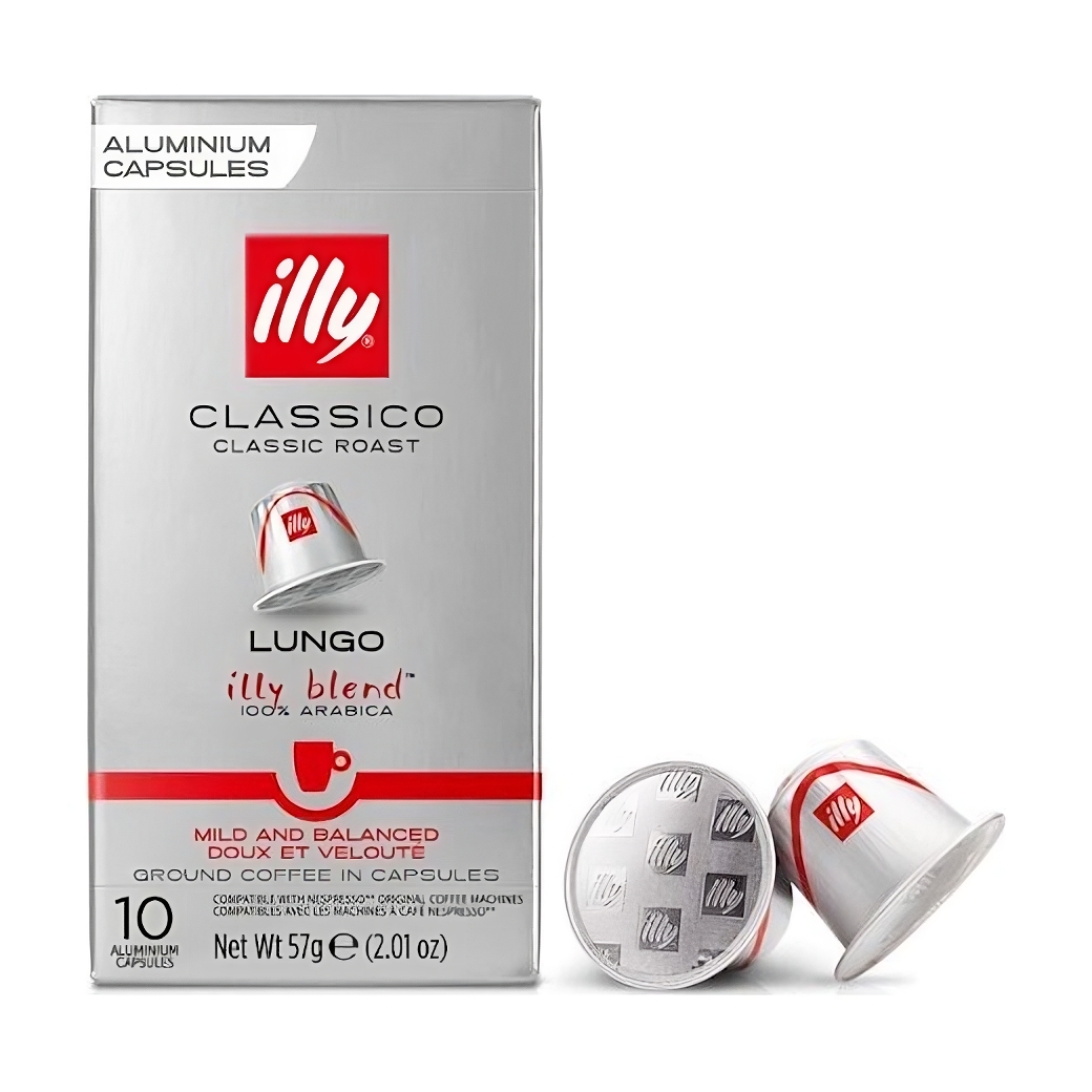 Illy Lungo Espresso coffee capsules compatible with Nespresso machines with a unique blend of 100% arabica. The harmony and essence of the illy blend in a capsule. Uniquely designed, in different types for every taste. The Lungo blend has a balanced taste with notes of caramel, orange blossom, jasmine and a sweet aftertaste. Lungo is more coarsely ground so more water flows and reaches the cup. Lungo is ideal for a larger cup of coffee.