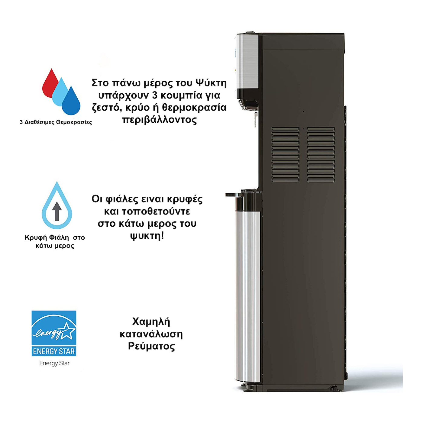 The advantage of bottom-loading water dispensers is that you don't have to lift the bottle to place it on top of the cooler, but you can slide it into the special storage area and the nozzle combined with the special pump will draw the water into the tank where then the water freezes.