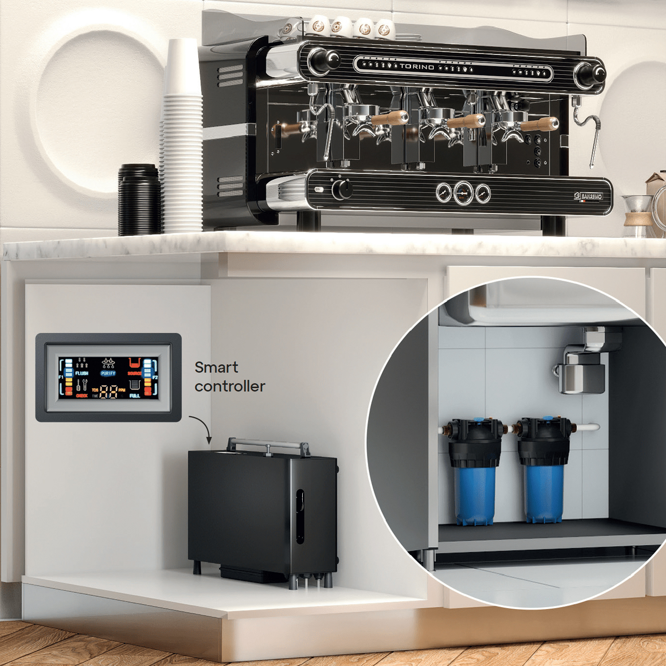 - Ενσωματωμένο TDS Meter – Άμεση παρακολούθηση της ποιότητας νερού σε πραγματικό χρόνο.