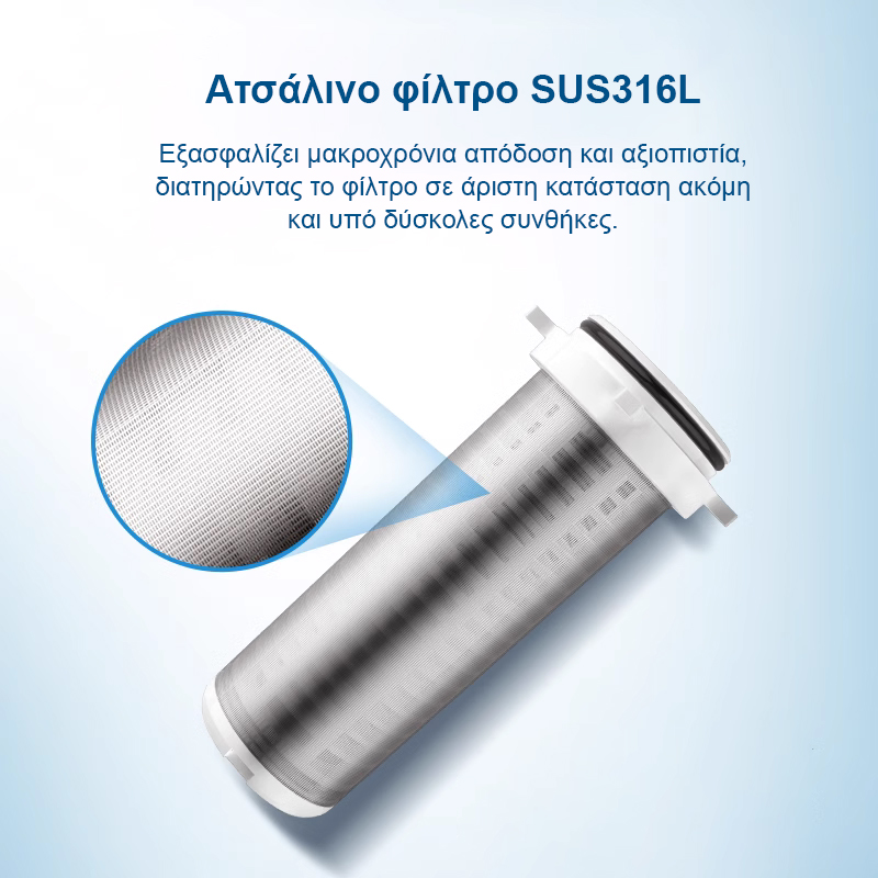 - Φίλτρο από Ανοξείδωτο Χάλυβα 316L: Ανθεκτικό και μακράς διαρκείας.
