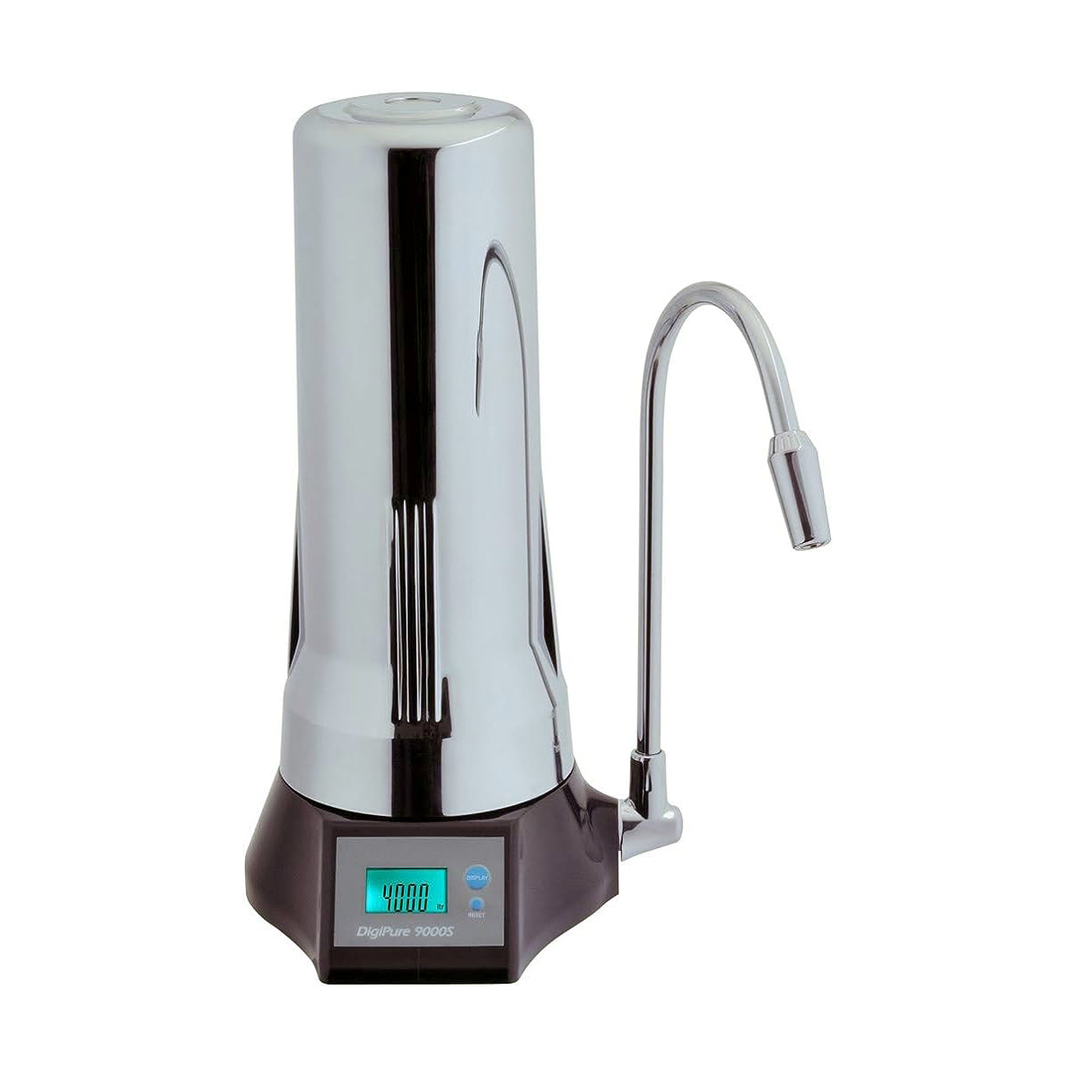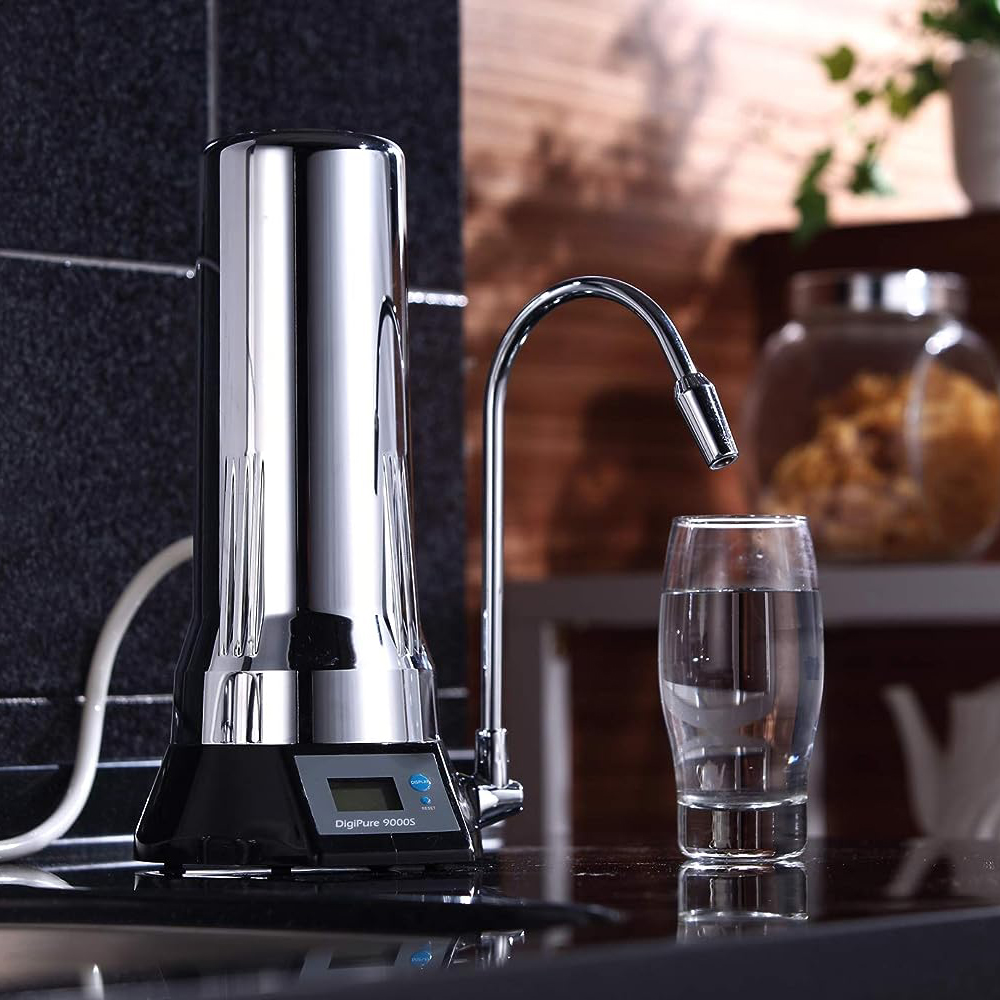Introducing the Digipure 9000S Countertop Chrome Water Filter. Upgrade the aesthetics of your kitchen with this elegantly designed water filter that fits seamlessly into any kitchen decor. Not only does it enhance the visual appeal of your space, it also brings a world of convenience and advanced filtration technology to your hands.