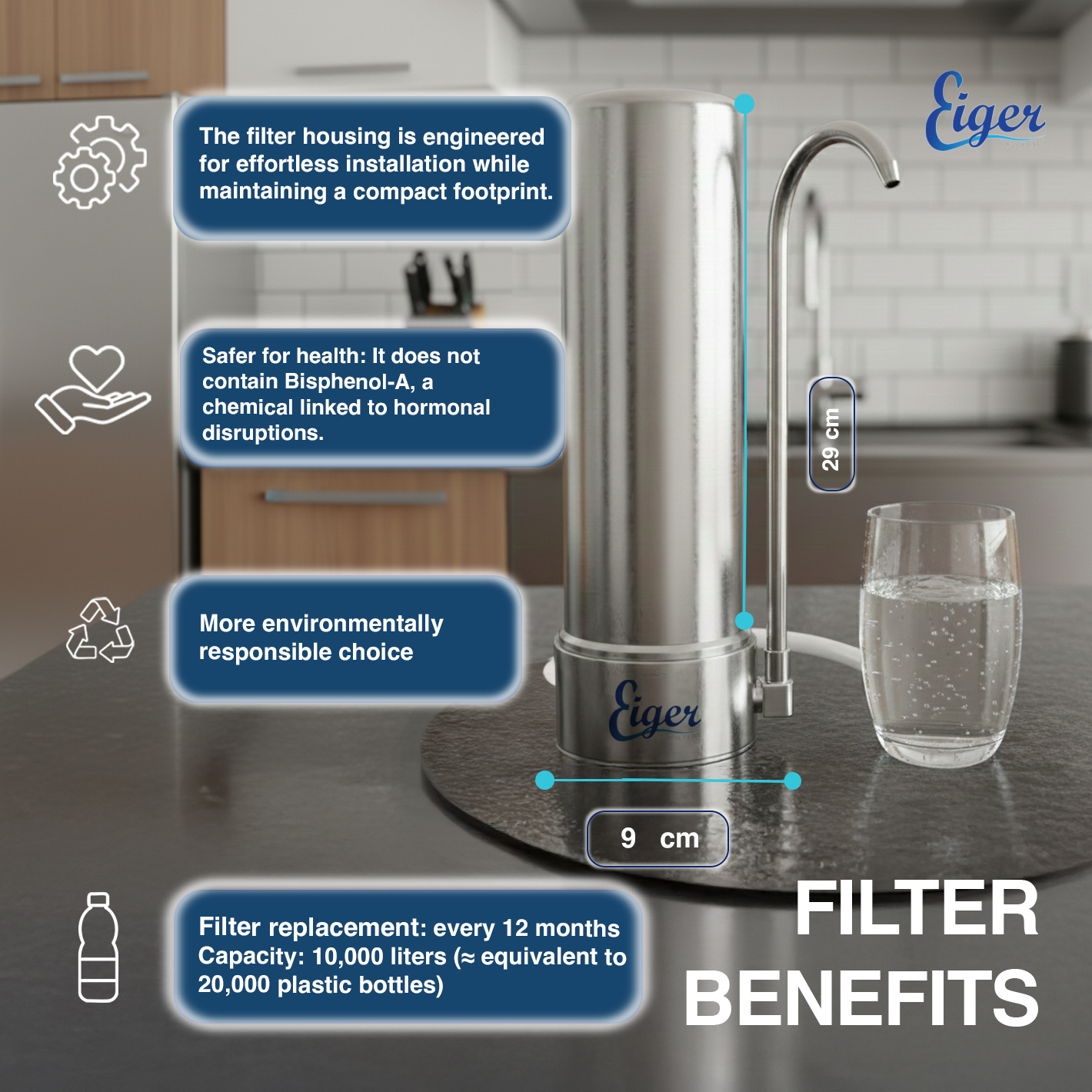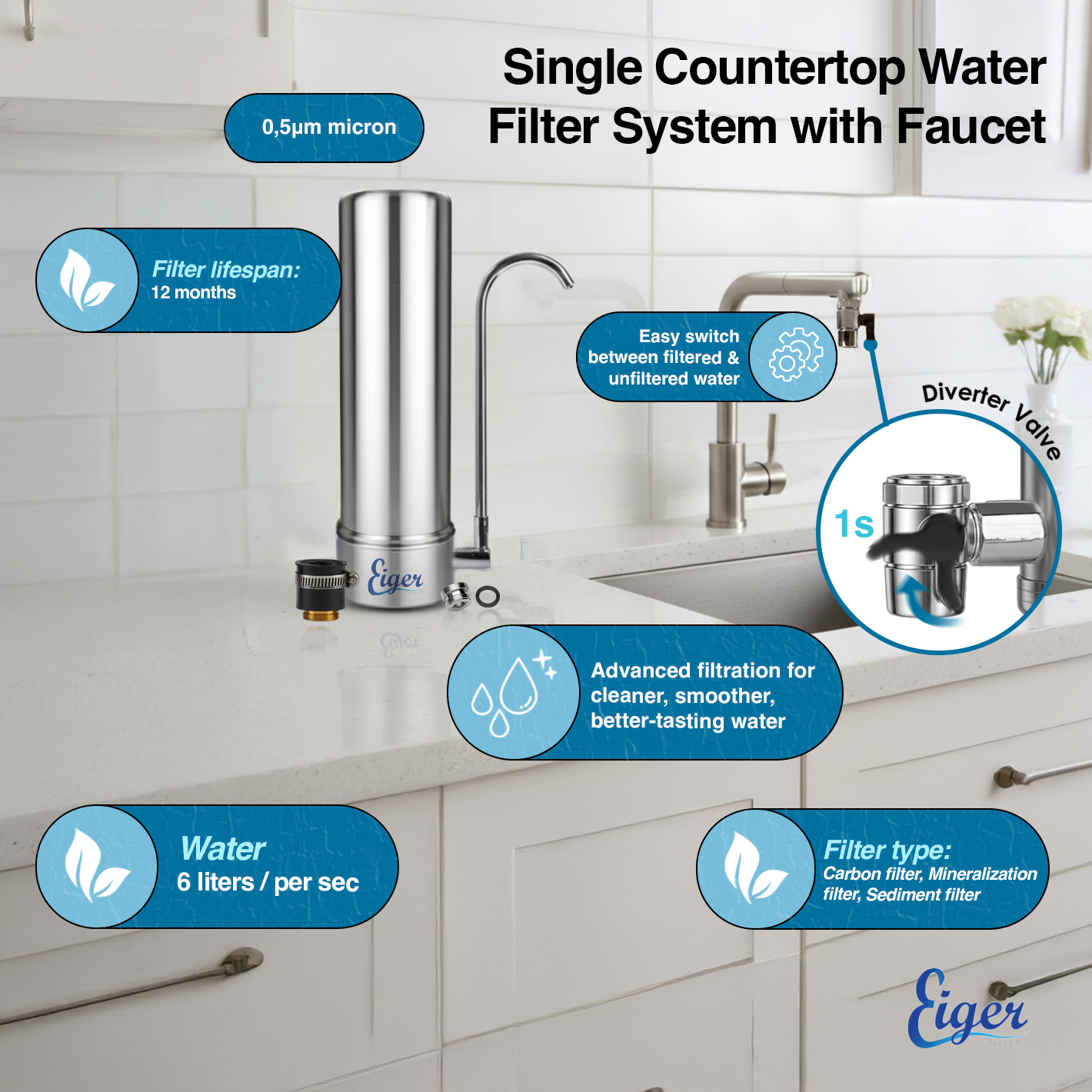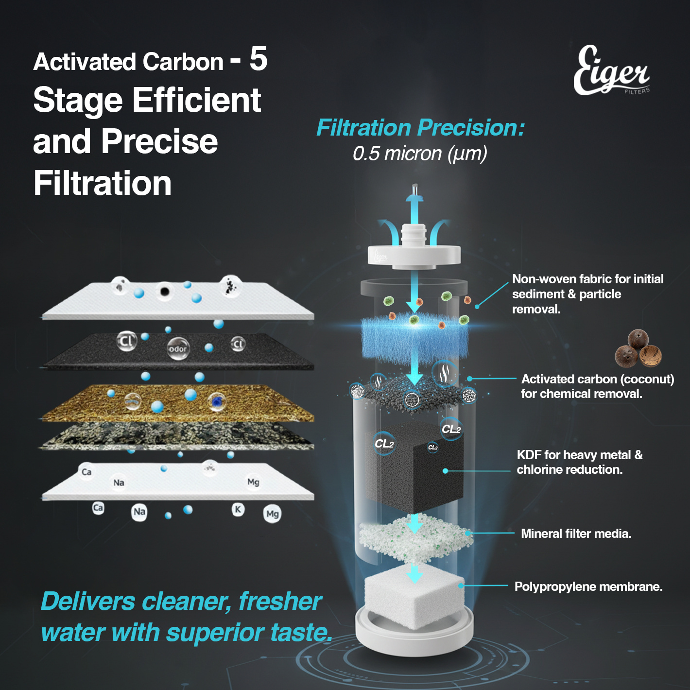 Το νέο φίλτρο νερού της Eiger χρησιμοποιεί φίλτρανση πέντε (5) σταδίων 0.5μm τεχνολογίας αιχμής για μέγιστο αποτέλεσμα φίλτρανσης ακόμα και σε περιοχές που αντιμετωπίζουν μεγάλο πρόβλημα με την ποιότητα του νερού.