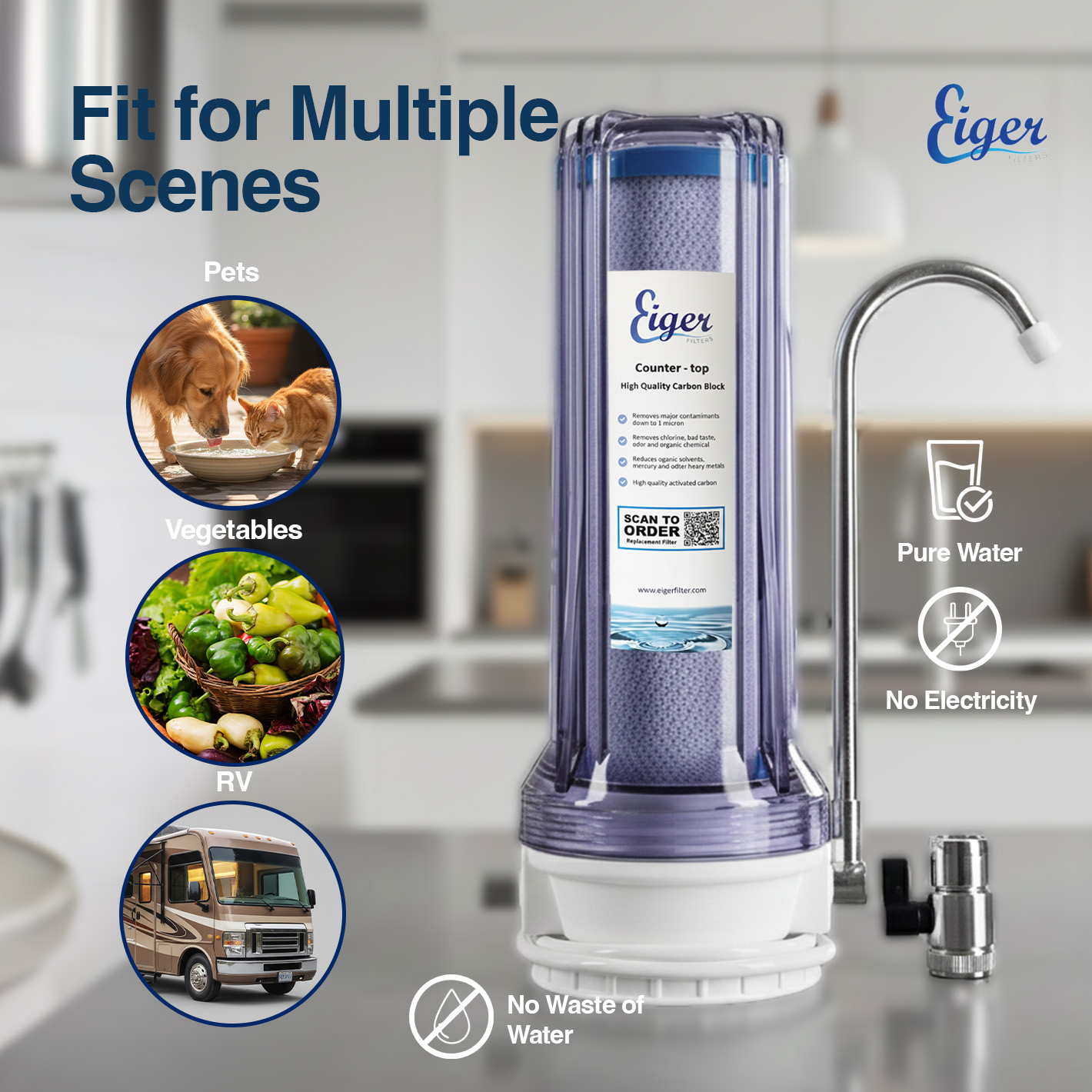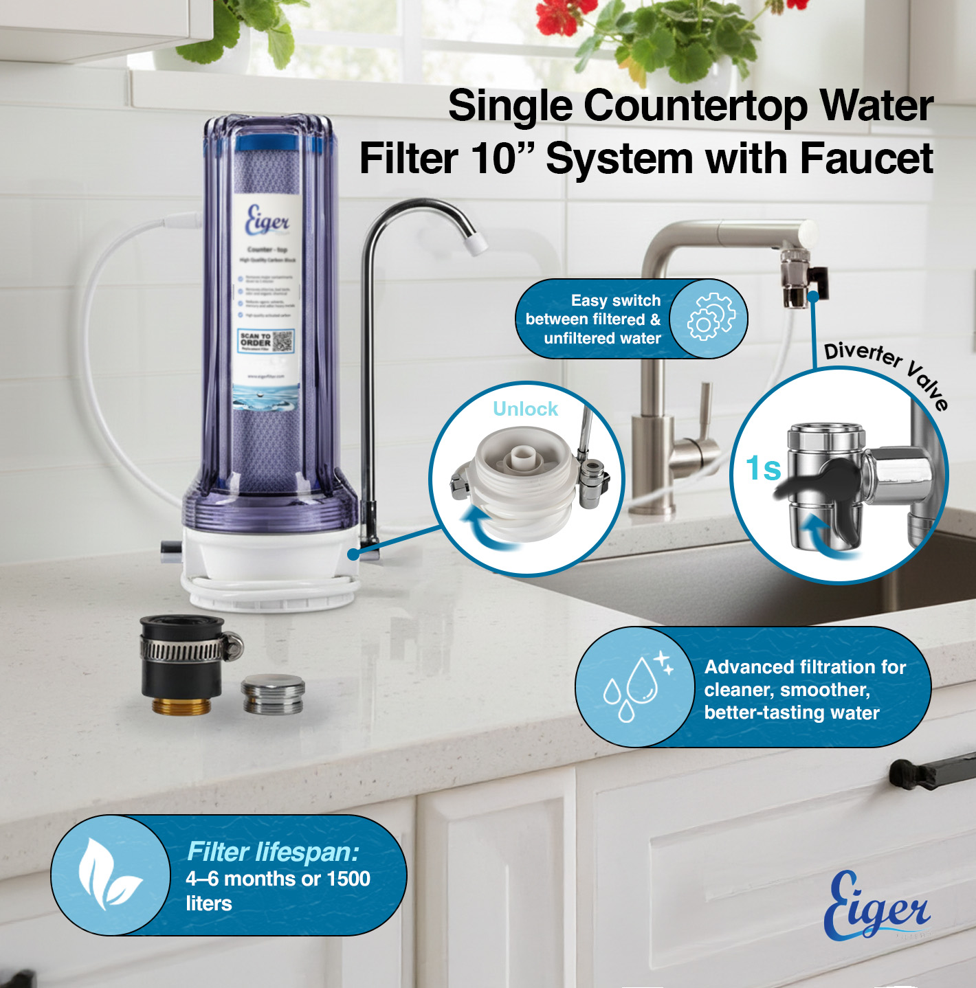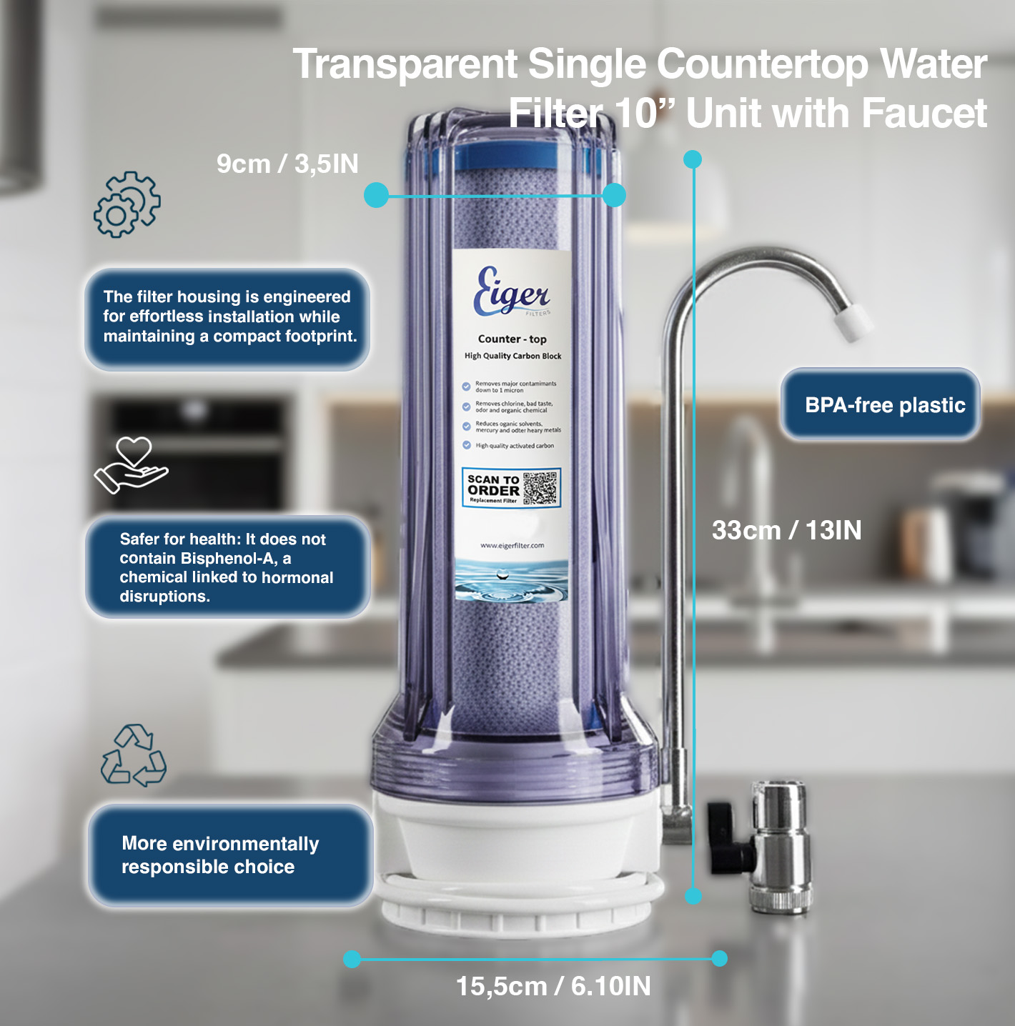 The Eiger Countertop Water Filter System is the perfect solution for those looking for a high quality filtration system that is easy to install and maintain. This premium water filter system is designed with a transparent housing, which allows you to see the filter inside and know when it needs to be replaced.