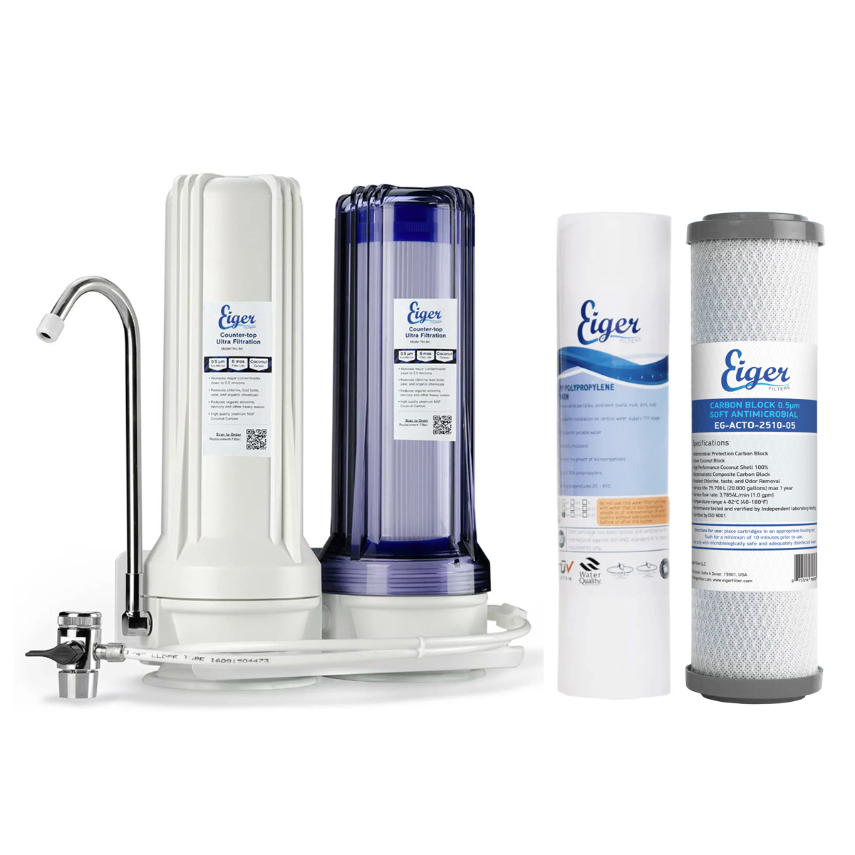 The Eiger Double Countertop Water Filter System is the ultimate solution for those looking for a top quality filtration system that is easy to install and maintain. This top-of-the-line water filter system is designed with a transparent housing, which allows you to see the filter inside the first stage (pre-filter) that usually needs to be installed in polypropylene (sediment filter) and know when it needs to be replaced.