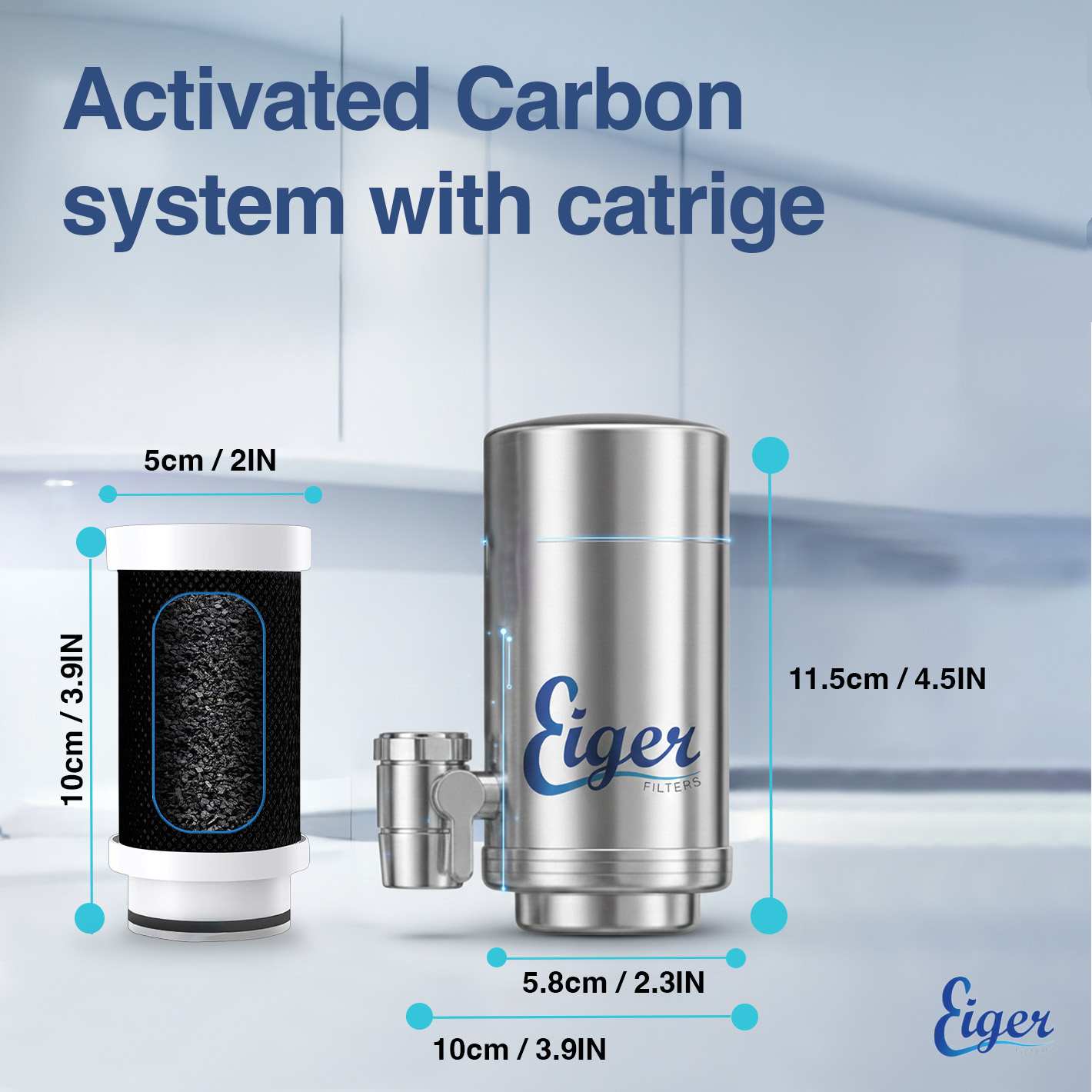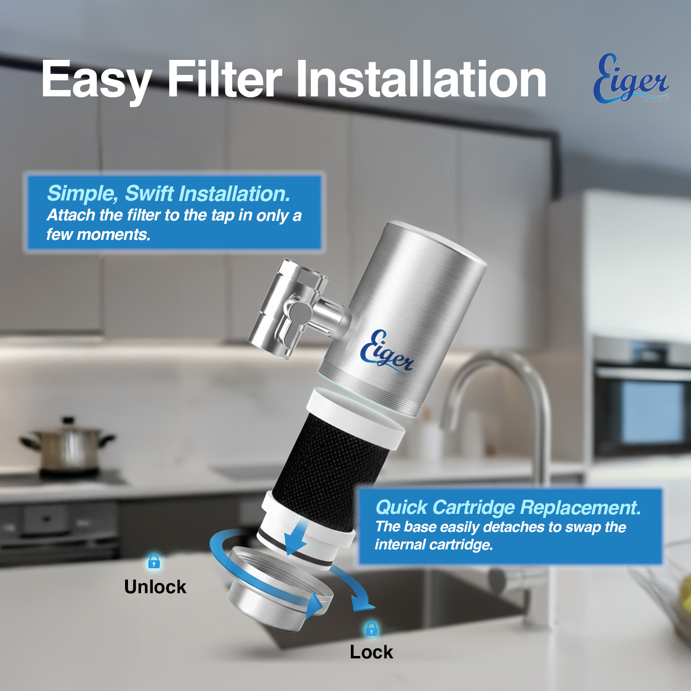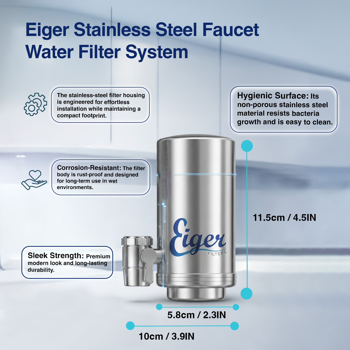High quality stainless steel casing: The Eiger water filter features a robust stainless steel housing that not only ensures durability, but also adds a touch of modern elegance to your kitchen.
