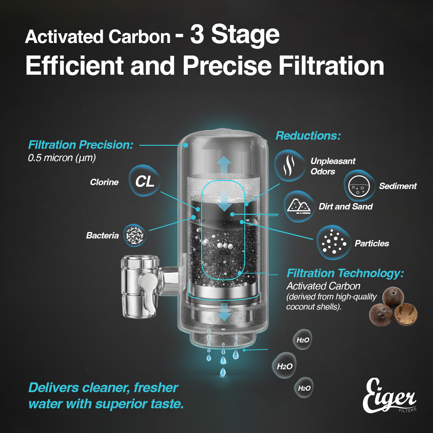 Compatibility: Designed to fit most standard faucets, the Eiger water filter comes with an adapter to fit a variety of faucet types, ensuring it can be easily integrated into your home.