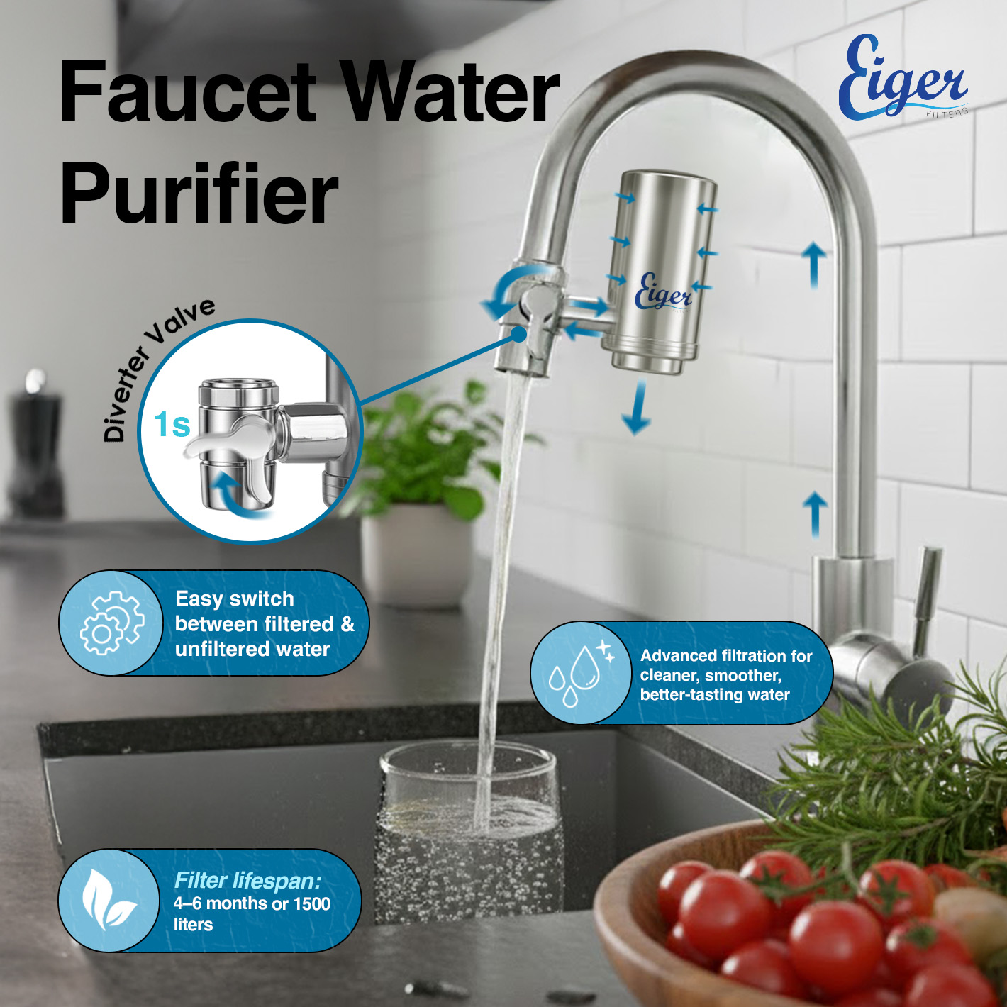 Flexible water control: The Eiger faucet water filter is equipped with a diverter valve, allowing you to seamlessly switch between filtered and unfiltered water directly from your tap. Enjoy the flexibility to choose the water that suits your needs.