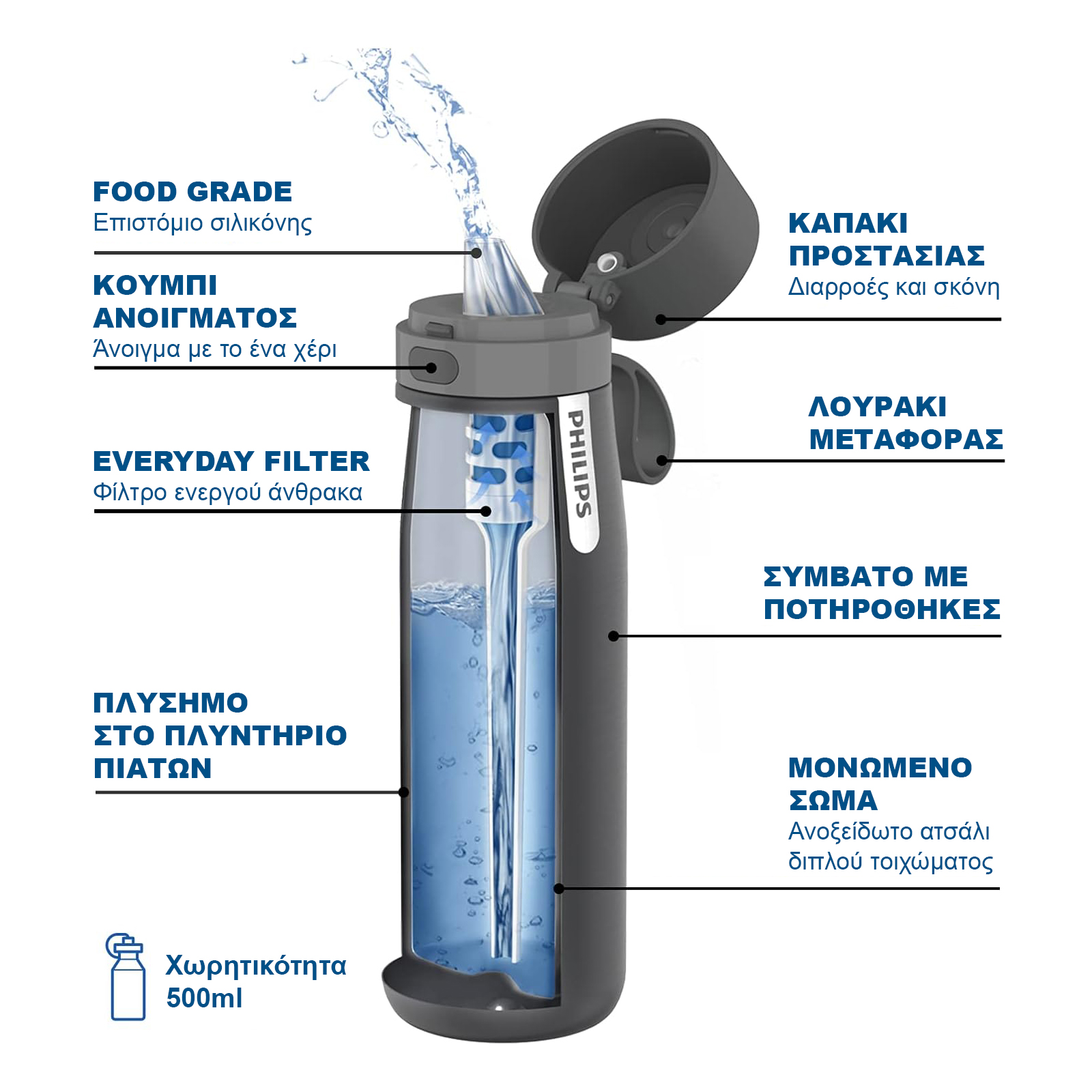 Μεταμορφώστε το νερό της βρύσης σας με το μπουκάλι νερού Philips GoZero με φίλτρο. Αυτό το καινοτόμο μπουκάλι χρησιμοποιεί ένα φίλτρο ενεργού άνθρακα για να μειώσει το χλώριο και τα σωματίδια, προσφέροντάς σας καθαρότερο, φρεσκότερο νερό εν κινήσει.