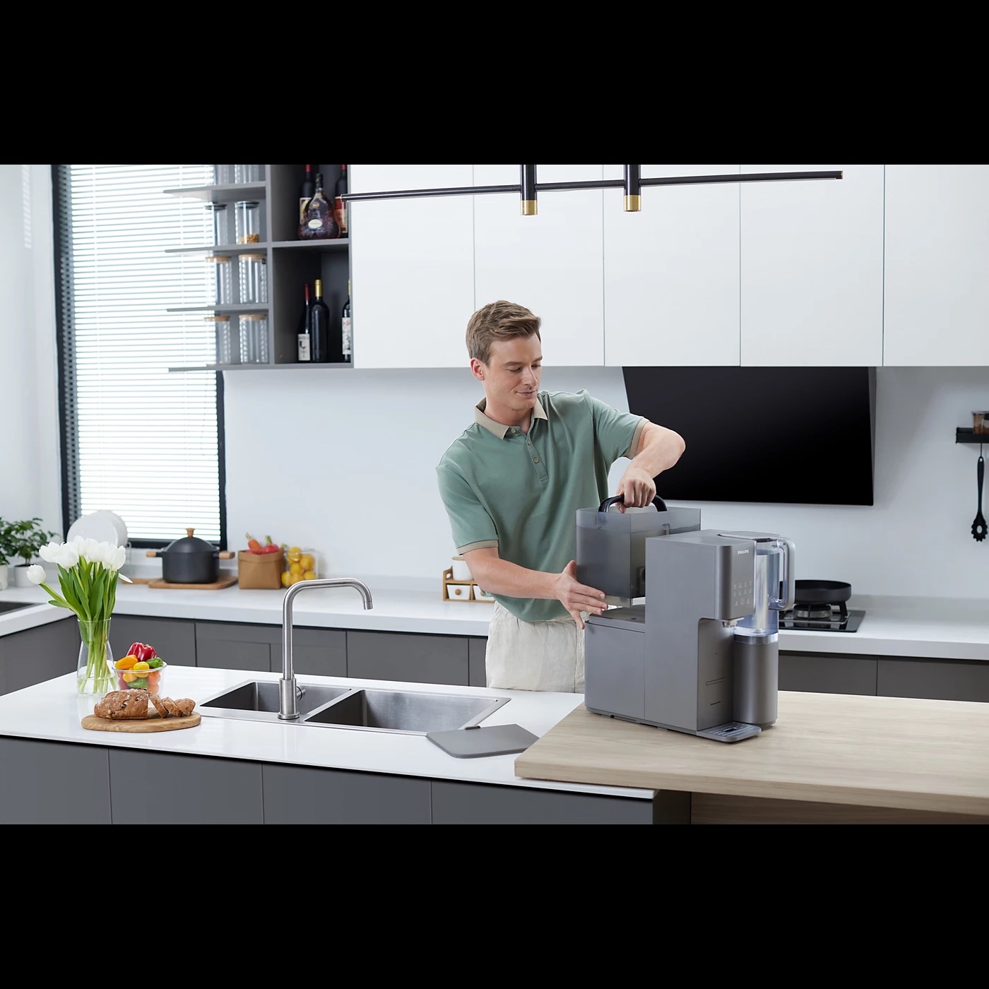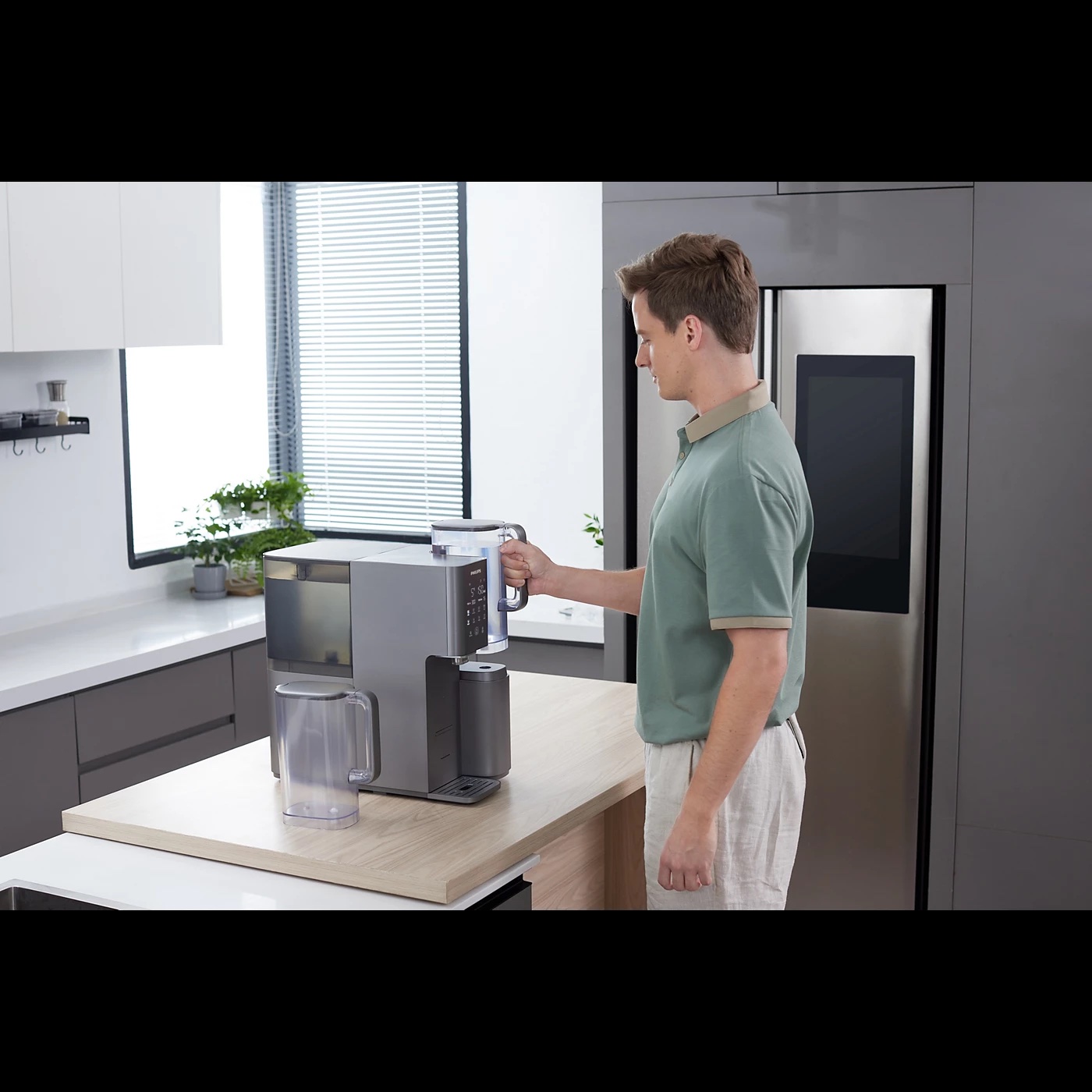 Αυτός ο σταθμός νερού διαθέτει δύο κανάτες νερού 1,8 L για καθαρό νερό. Έχετε πάντα άφθονο καθαρό νερό για το μαγείρεμα και την παρασκευή ποτών. Αποθηκεύστε μια κανάτα στο ψυγείο για καθαρό κρύο νερό.